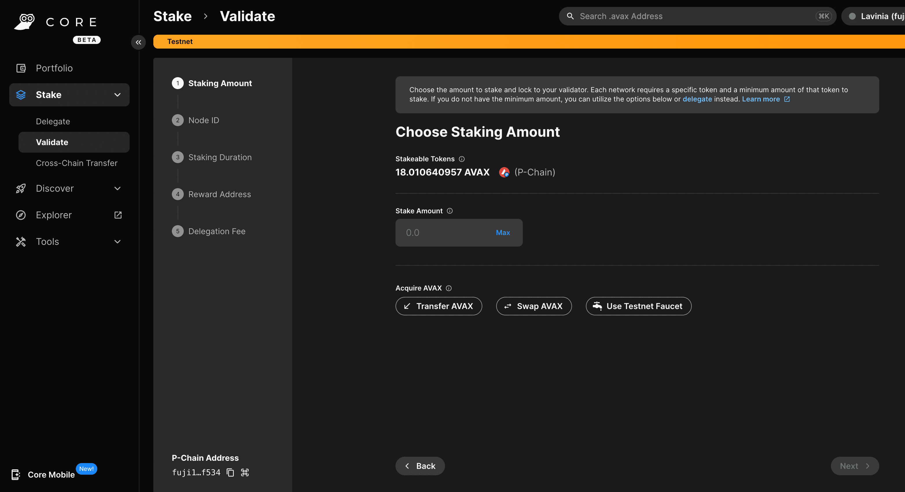 For adding the new node as a Validator on the Fuji testnet's Primary Network you can use the Core web connected to Core extension. If you don't have a Core extension already, check out this guide. If you'd like to import an existing wallet to Core extension, follow these steps.
